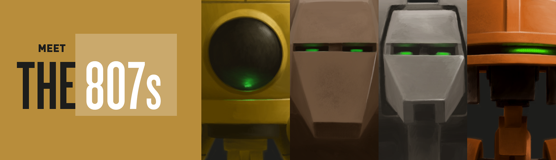 1. Jason Argo with his beloved gorillas 2. Inside Jason’s Lab. 3. Gorillas getting to know R0807s. 4.The first model GO-807 patrolling the rainforest. 5. Cinematic view from the HQ docking area.